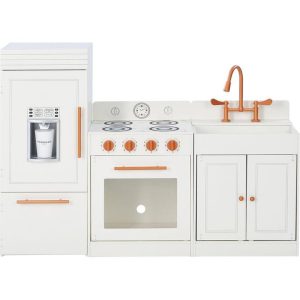 The Little Chef Paris Modular Wooden Play Kitchen comes in three units in a sleek white finish with rose gold hardware. The refrigerator features a working ice dispenser, the oven has turning knobs that click, and the deep farmhouse-style sink features a vintage-style faucet with handles that turn. The interactive feat