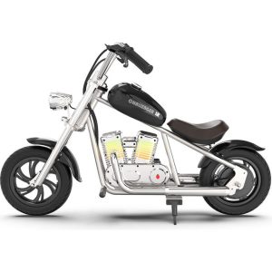 The HYPER GOGO Challenger 12 Plus is an exhilarating electric ride-on designed for kids, merging bold style with reliable performance! Its rugged 12-inch pneumatic tires ensure a smooth ride across diverse surfaces, while the eye-catching chopper aesthetic is enhanced by features like simulated smoke effects and vibran