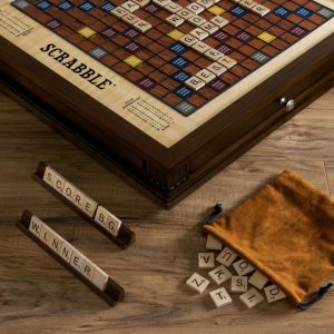 Enhance your next Scrabble match with our Grand Folding Edition. This premium wooden set transforms America’s favorite word game into a beautiful addition to your home. The oversized game board, attractively framed in wood, features a folding, rotating design for convenient gameplay and easy storage. Premium details in