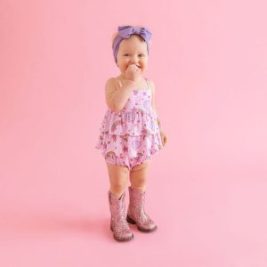 Spaghetti strap bubble rompers are the perfect lightweight summer outfit! Päpook® viscose from bamboo is buttery soft, breathable, and oh so cute! Spaghetti straps, ruffled bodice, and snap closure for an easy diaper change. Sleeveless with a ruffled bodice Inseam snap closure for an easy diaper change Printed ribbed v