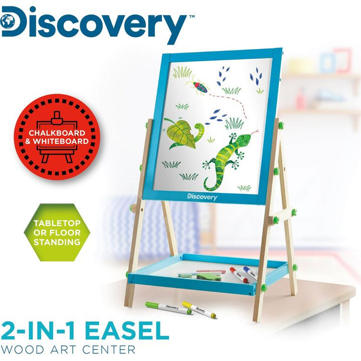 Unlock the potential of young artists with the Discoveryâ„¢ 2-In-1 Easel Wood Art Center, a versatile and engaging art station that features both a whiteboard and chalkboard. This easel features an easy DIY assembly and adjustable angle for comfortable use on tabletops or floors. The integrated storage tray ensures that