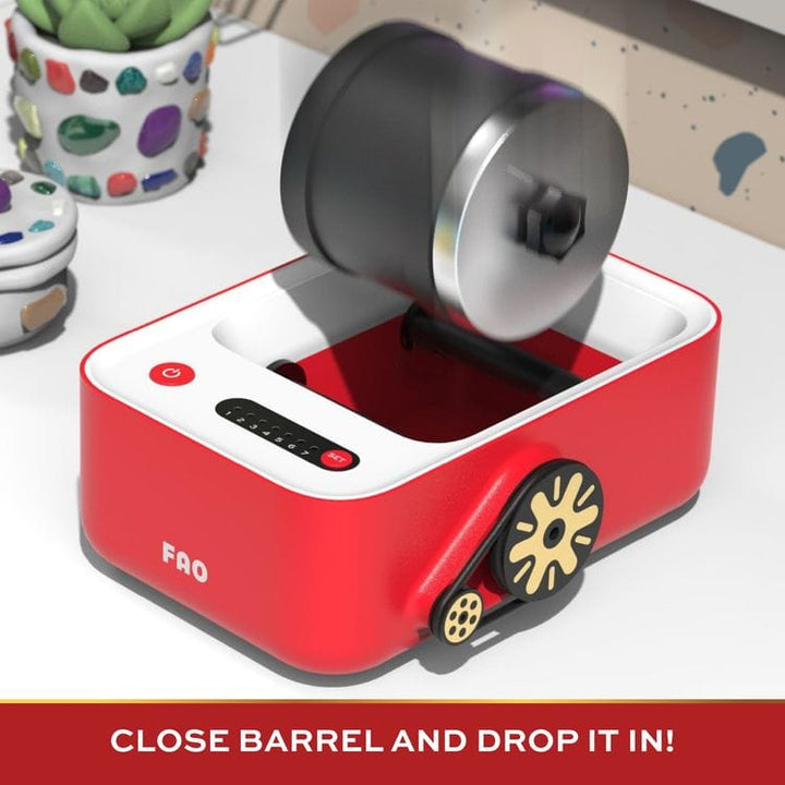 Spark your child's interest in geology and art with the FAO Schwarz® Professional Rock Tumbler with Clay & Gemstones. This complete set allows kids aged 8 and up to turn ordinary rocks into shiny, polished gemstones using a professional-grade rock tumbler with a noise-reducing rubberized barrel. After polishing, ch