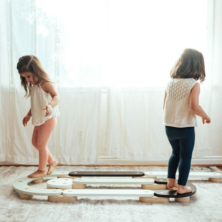 Walk the straight and narrow on our Balance Beam. Little feet can trapse across the nearly 4″ wide wooden planks, Kids can set up any configuration using the 10 connecting pieces, with 4 straight and 2 curved planks. All wood and non-toxic paint make this a fun activity that helps develop large motor skills and can