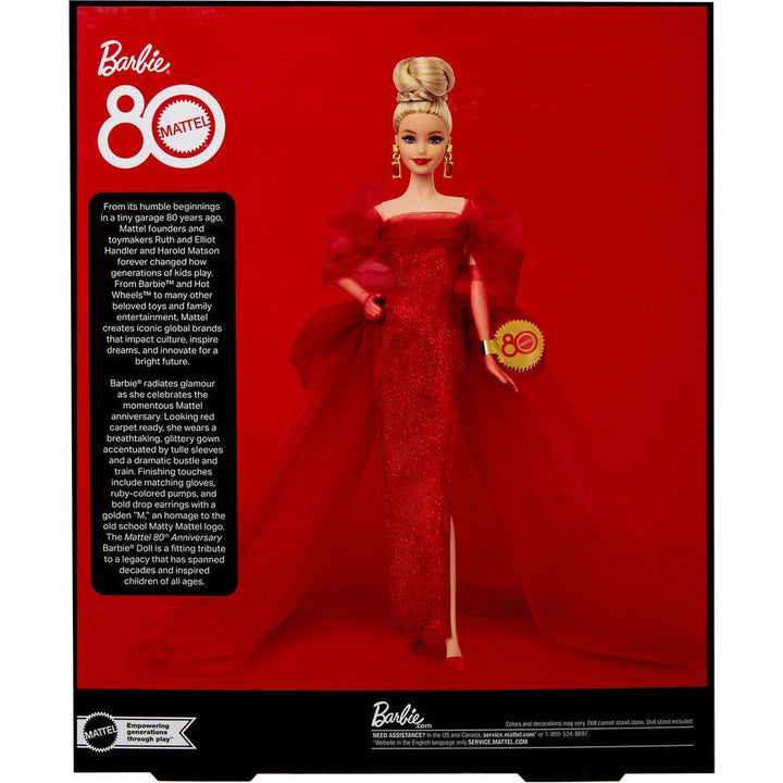 Eight decades of iconic toymaking warrants a special design to mark the occasion. Behold our Mattel 80th Anniversary Barbie doll, a stunning keepsake that honors the legacy of a company that has inspired generations. She looks red carpet-ready in a glittery gown accentuated by bow-like sleeves and a dramatic tulle bust