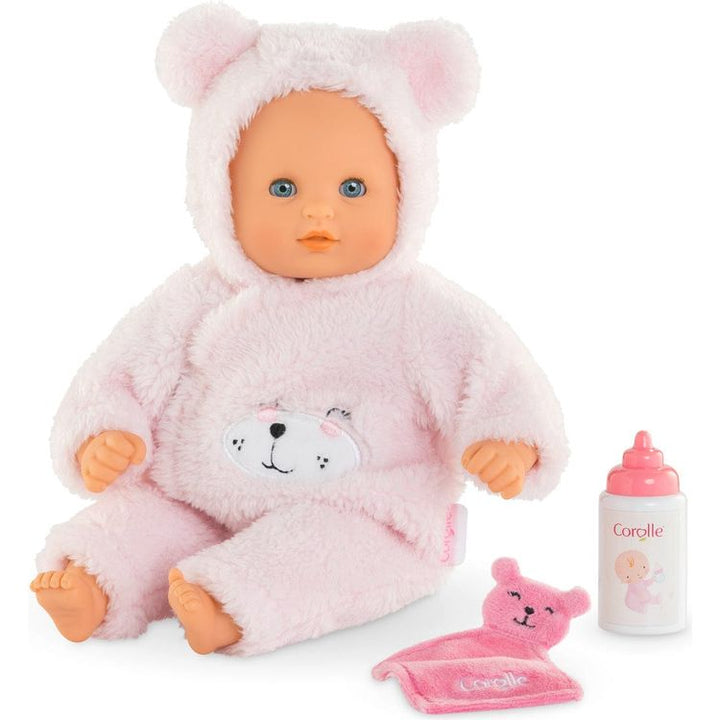 Bébé Calin Loving Teddy Bear is a 12-inch baby doll that is perfectly sized to be cradled in a young child's arms and is ideal for hugging and cuddling. The doll's face, arms and legs are made of touchably soft vinyl that is delicately scented with vanilla — a Corolle signature. Bébé Calin Loving Teddy Bear's soft bod