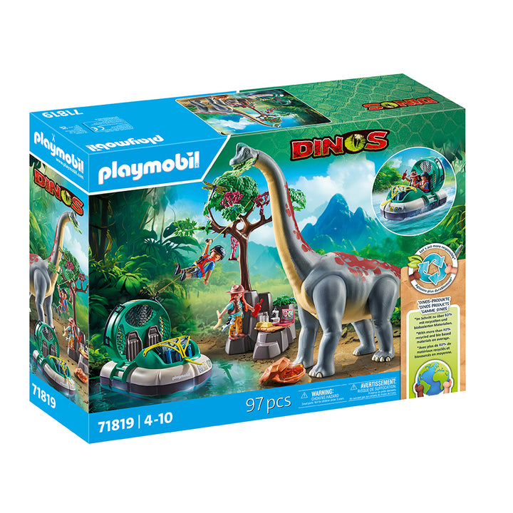 How do you get close to a gigantic Brachiosaurus? With a hovercraft, of course! Some members of the research team remain in the hovercraft while one daring researcher uses the zipline to get closer to the creature to observe it feeding. She uses her advanced equipment to document the brachiosaurus' behavior and pattern