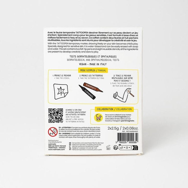 Tattoopen Kit, The Rabbit by Ami Imaginaire – Immerse yourself in the animal world of this new limited-edition kit created with the artist Ami Imaginaire!The set contains : 1 brown temporary tattoo pen, 1 black temporary tattoo pen and 1 sheet of 8 reusable stencils with designs inspired by the world of Parisian artist