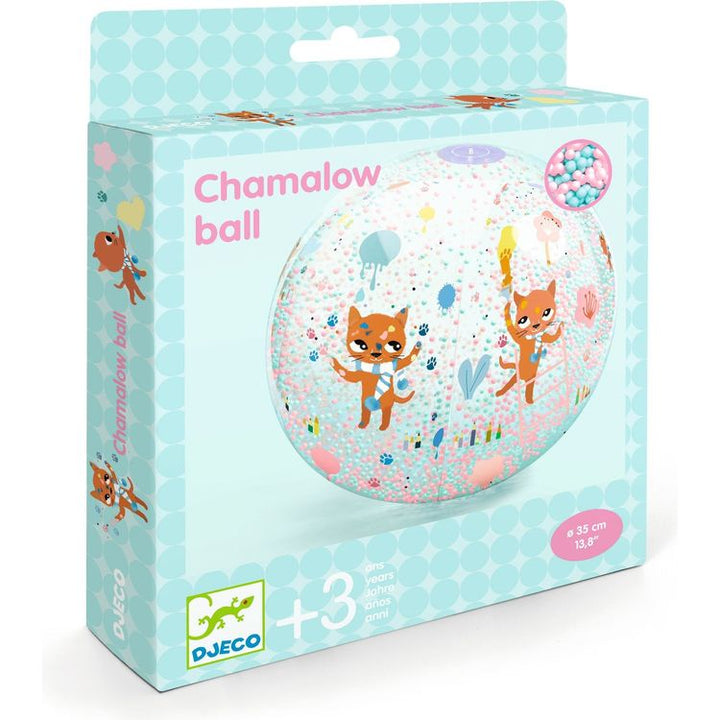 Chamalow ball is a light, easily transportable inflatable ball measuring 35 cm in diameter illustrated with an adorable little cat. The filling makes it perfect for children, who will be captivated by the moving coloured beads. Perfect for use indoors or outdoors. Filled with very light beads to avoid weighing down the