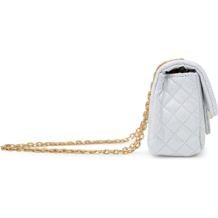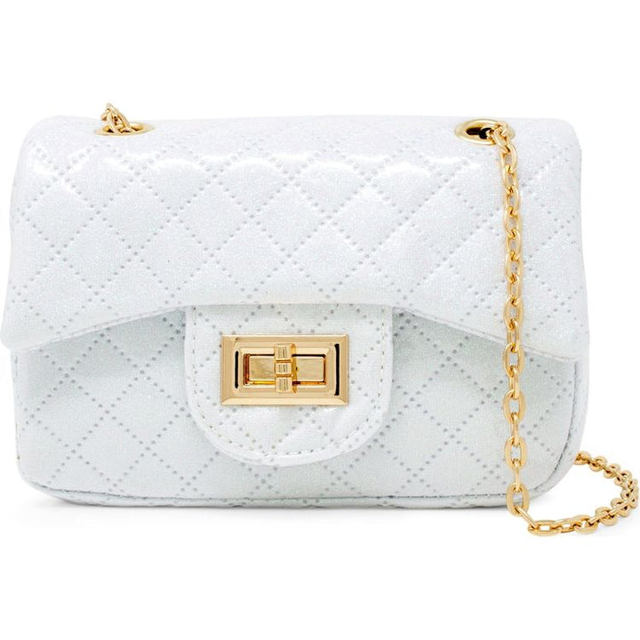Designed to dazzle and delight, this bag is the perfect accessory to add a touch of glamour to any little one's outfit. Featuring a glossy patent quilted design with a timeless twist closure, this purse is both stylish and functional. The gleaming gold plated hardware adds a touch of sophistication, and the adjustable