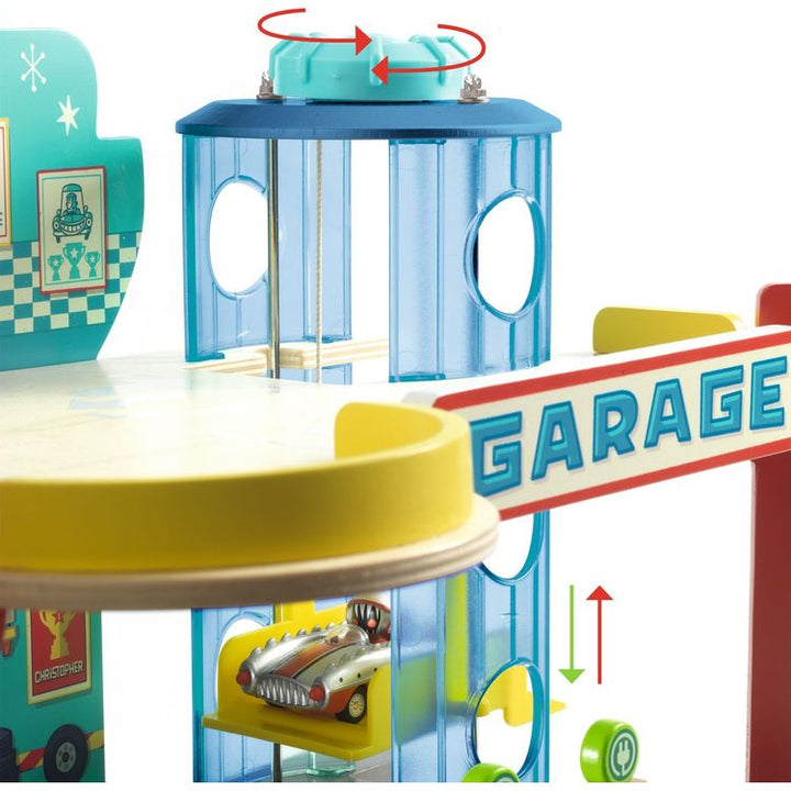 Start your engines for whimsical imaginative adventures! This gorgeously designed wooden garage is a gift that wows! Bursting with charm, it's equipped with exciting features: a lift that raises cars to the top level, a ramp for a thrilling exit, colorful storytelling illustrations, and detachable accessories like roll