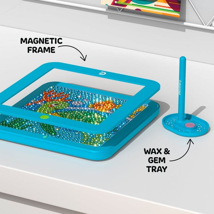 Create, light up, and display with the Discoveryâ„¢ Dazzle Art Light-Up Diamond Painting Kit. This comprehensive craft kit lets you dive into the world of diamond art, featuring over 800 gems and a special adhesive art sheet to diamond paint a vibrant sea turtle. Illuminate your finished piece with the built-in LED light