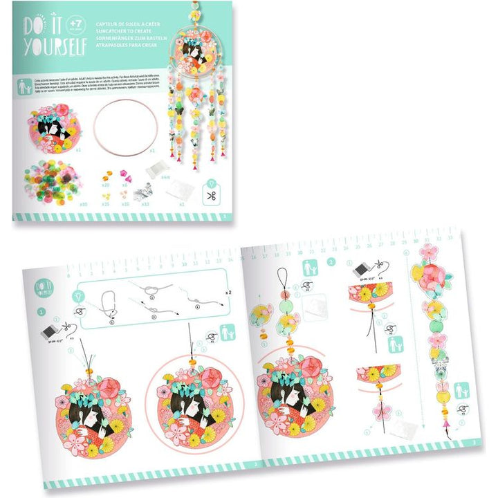 Introducing a comprehensive creative kit that allows you to create a beautiful and poetic suncatcher. With this kit, you can decorate the hoop with all the included pieces, such as decorative shapes, beads, ribbons, and transparent discs, to make a unique and stunning decorative object.Hang it in your bedroom near a wi