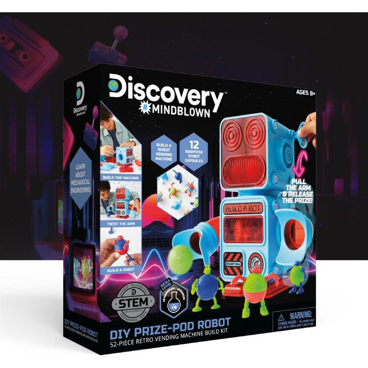 Introducing the Discoveryâ„¢ #Mindblown DIY Prize-Pod Robot – a 45-piece retro vending machine build kit designed to spark curiosity and imagination through STEM learning and creative play! Watch your child assemble a unique and exciting robot vending machine that dispenses 12 prize-filled capsules, each containing piece
