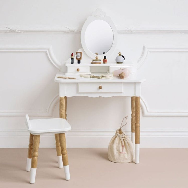 Step back in time with this vintage style dressing table. The vanity table features an oval Victorian inspired mirror sat on a 2-tiered table with storage drawers. Beautiful wooden turned legs adorn the table, decorated with a combination of white paint and natural exposed wood throughout. Complete with a matching stoo