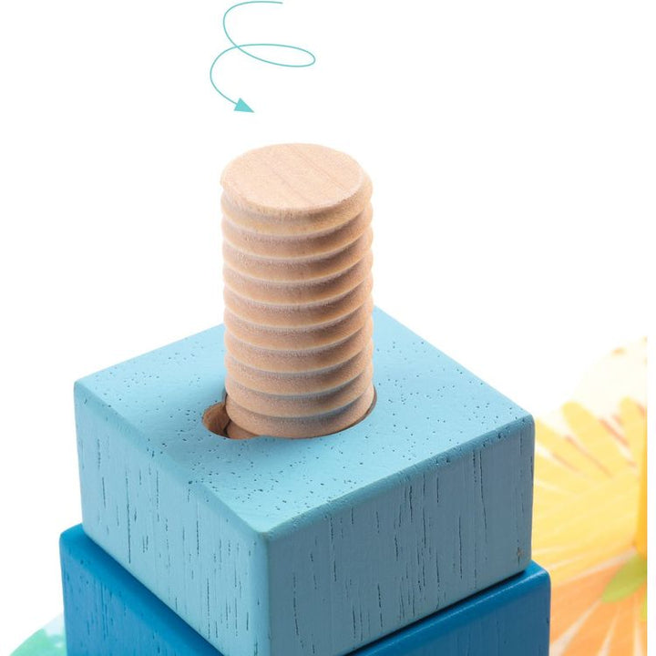 Fun Djeco stacking blocks where the kid can learn a lot from stacking the blocks and seeing through the different sizes. The Djeco game has three different stacking pegs, each with its own way of getting the blocks. The Blocks can be stacked according to shape and size. The Blocks are painted as three different animals