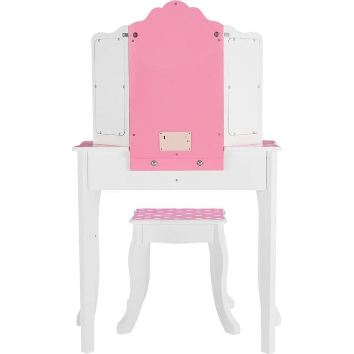 Gisele's Polka Dot Vanity Playset is a fun addition to playing dress-up. Made of engineered wood with rounded corners and cabriole legs, the vanity table features a tri-fold acrylic mirror with the central mirror surrounded by LED lights. White with pink and white polka dot accents, including on the central storage dra