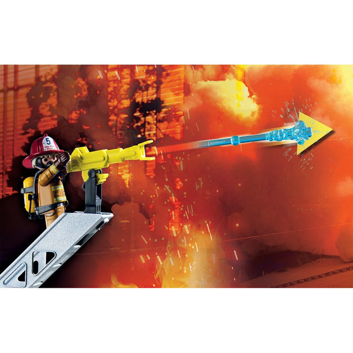 Be a hero in PLAYMO City with the PLAYMOBIL Fire Truck, featuring a ladder that spins and a rotating and swiveling water cannon to knock down the flames with the water arrows. Equip your figures with a respirator and oxygen tank for the rescue mission. Use the large compartments on both sides of the vehicle to store th