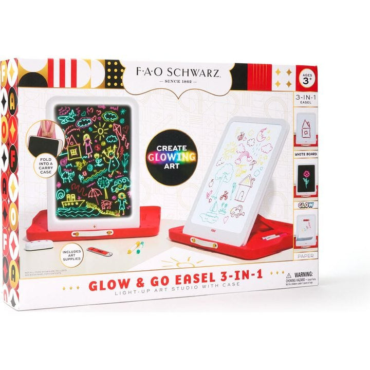 Unleash your child's creativity anywhere with the FAO Schwarz® Glow & Go Easel, a 3-in-1 Light-Up Art Studio that’s designed for versatile drawing and portability. This innovative art studio lets budding artists use it as a whiteboard, a neon glow board, or attach paper for traditional or tracing drawing methods. E