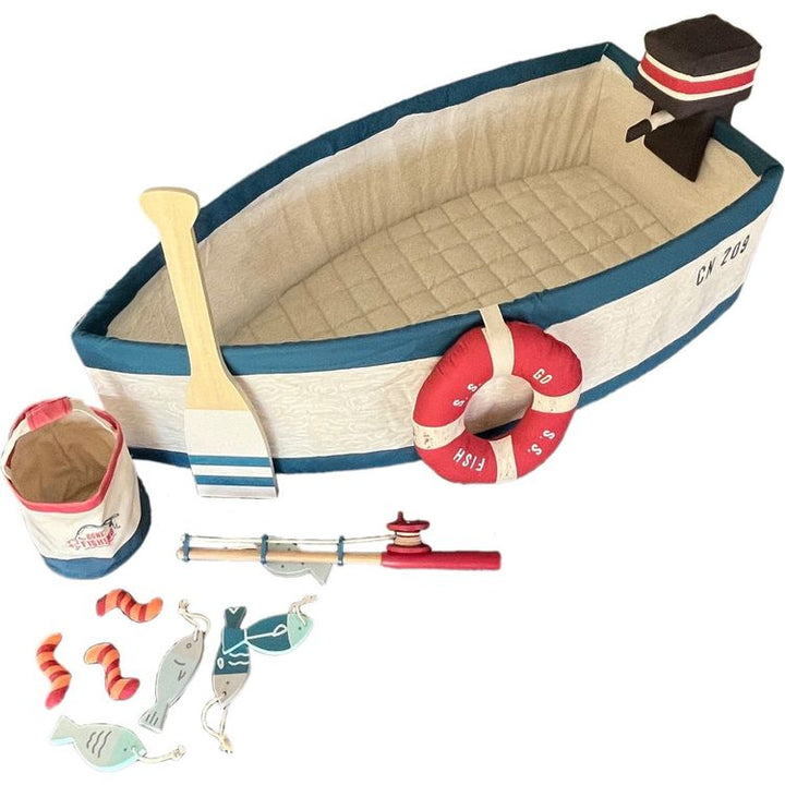 By the sea?? Not with our Gone Fishing Boat! You can be by the playroom, by the bedroom, or by any room with our fun canvas boat that includes plush motor, wooden oar and plush life preserver for “man overboard”. And rowing your boat is so easy to sit in, with a soft poly filled bottom that is cushy for the tushy!