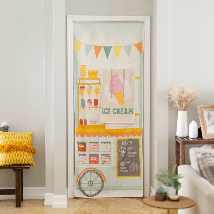 The Ice Cream & Coffee play shop is a two-in-one storefront play set made from machine-washable poly-cotton canvas, is easy to hang, and takes up almost no space to inspire hours of pretend play. One side is an ice cream shop printed with various cones and flavors. The other is a coffee shop showcasing an espresso