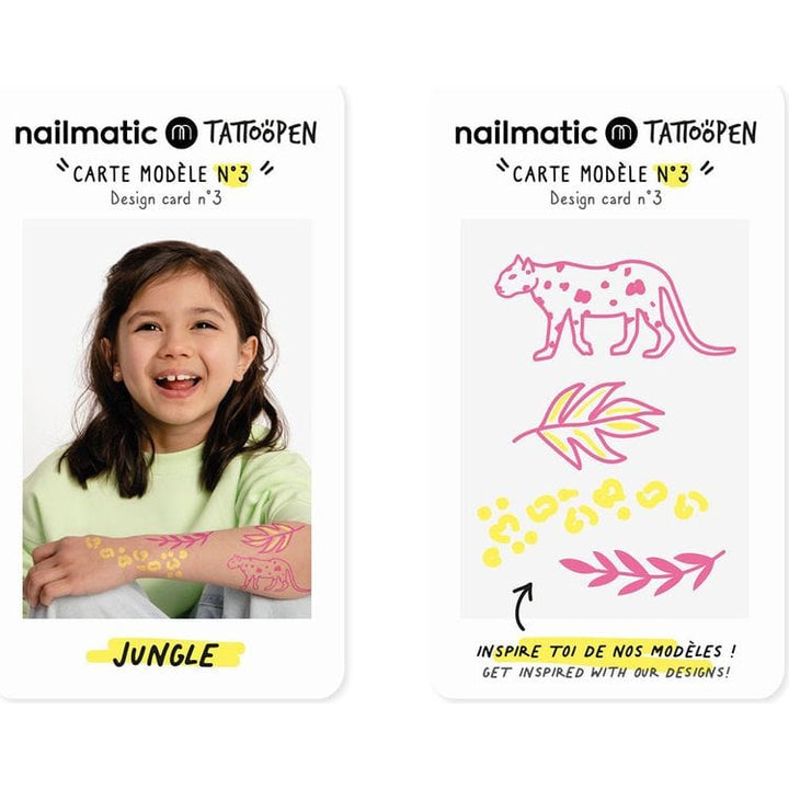 Let's have fun drawing on skin! 2 temporary tattoos felt pen and template cards. Little adventurers will definitely have a blast! So your children dream of traveling far far away? This box is made for them! A great gift for colours explorers. It's full of ideas for creating awesome jungle-themed tattoos: foliage, butte