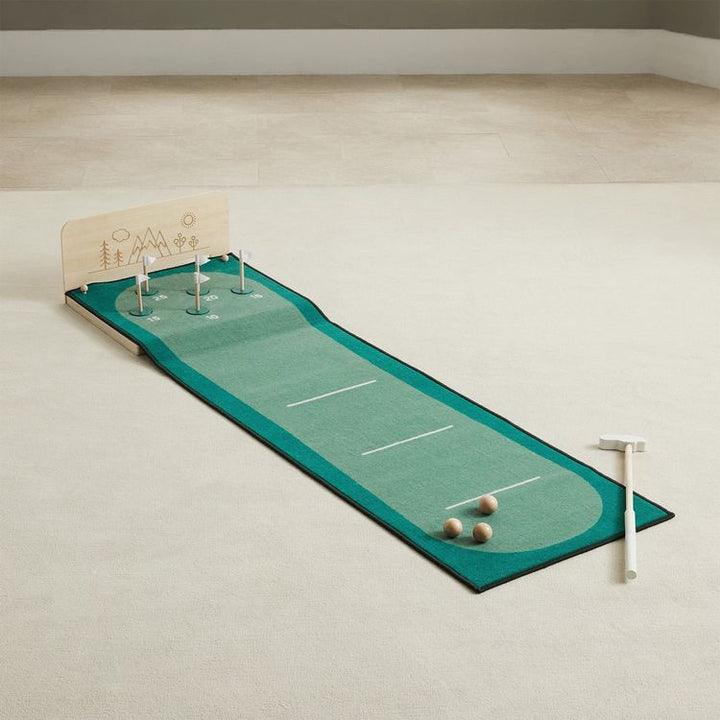 Practice the perfect putt with our Keen Putting Green! Every little tiger will love our practice putting green which overlooks a resplendent view of the mountains and sunshine (etched into a plywood backboard). Comes complete with 5 flags on wooden bases that fit into holes with printed scores, an adjustable height g