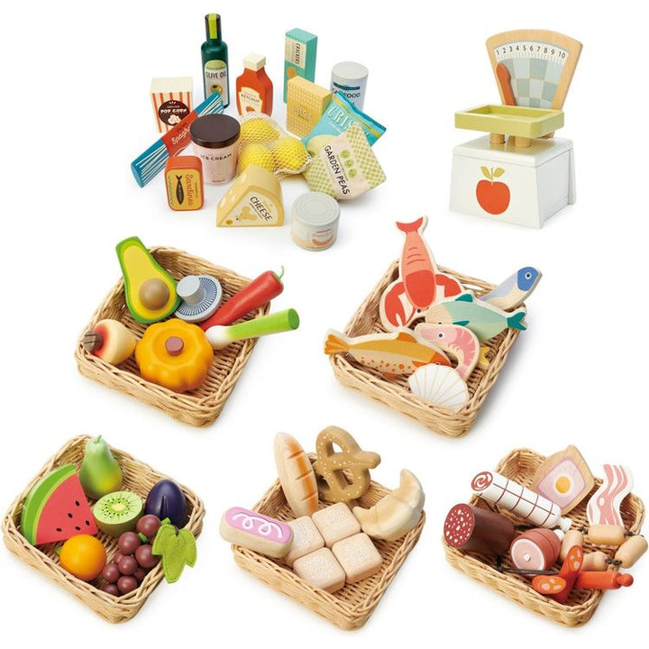 The ultimate pretend play grocery set! Set includes: Supermarket Grocery Set, Market Scales, Veggie Basket, Seafood Basket, Fruity Basket, Bread Basket, Charcuterie Basket. Ages 3 Years + PLEASE NOTE: There is a shipping fee associated with this item.Â