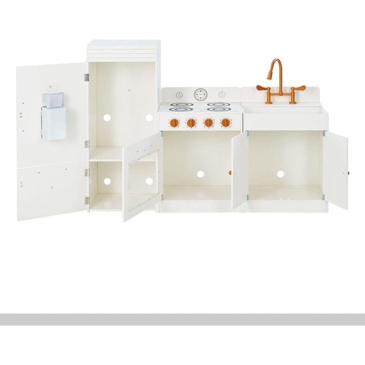 The Little Chef Paris Modular Wooden Play Kitchen comes in three units in a sleek white finish with rose gold hardware. The refrigerator features a working ice dispenser, the oven has turning knobs that click, and the deep farmhouse-style sink features a vintage-style faucet with handles that turn. The interactive feat