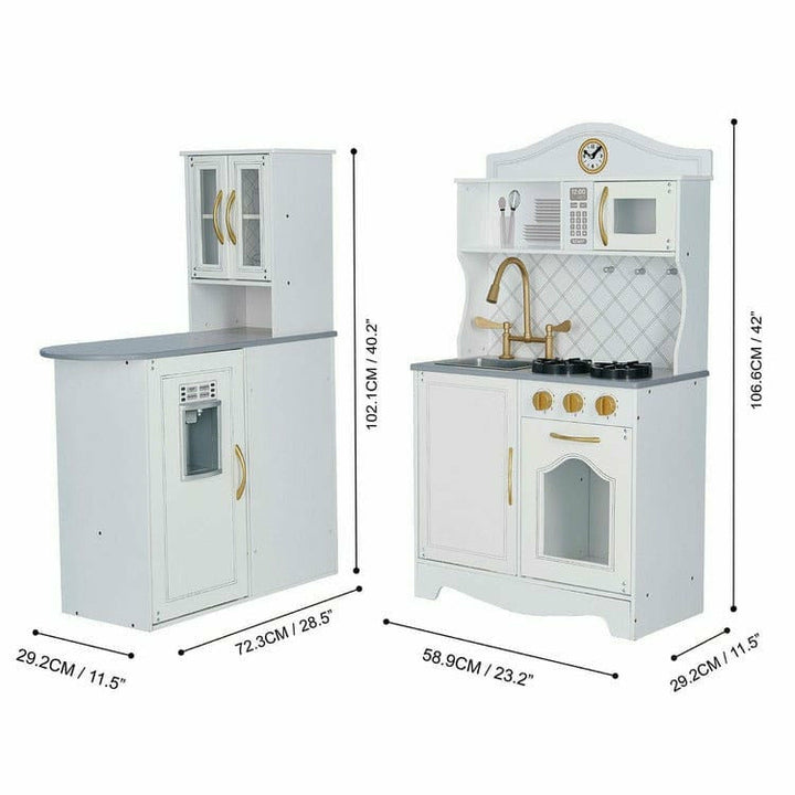 Help your little one create gourmet meals of their own with the Teamson Kids Little Chef Upper East Retro Kids Kitchen Playset. This L-shaped, classic play kitchen features a classic white look with gold accents. The stove lights up red and produces a boiling sound when pot or pan is place on top, mimicking a real-life
