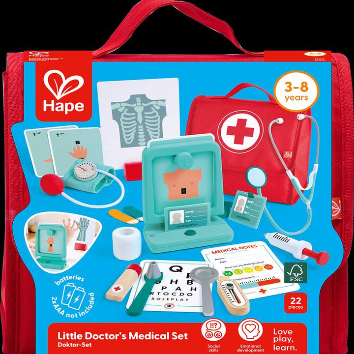 Get ready for hours of imaginative play with the Hape Little Doctor's Medical Set! This fun and interactive set includes all the essentials for budding young doctors, such as a stethoscope, syringe, thermometer, and medicine bottles—all stored in a handy fabric doctor’s bag. Whether checking a patient’s heartbeat, givi