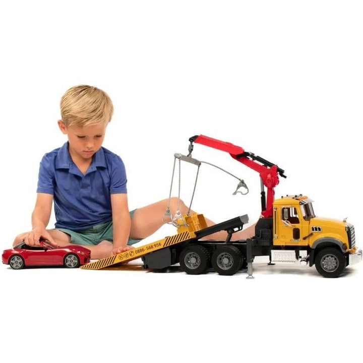 Tow trucks are versatile tools in traffic. Regardless of whether they load up broken down vehicles and take them to the workshop or remove illegally parked vehicles. The MACK tow truck featuring many functions has now been added to the Bruder range. The platform can be lowered to recover vehicles. It is also possible t