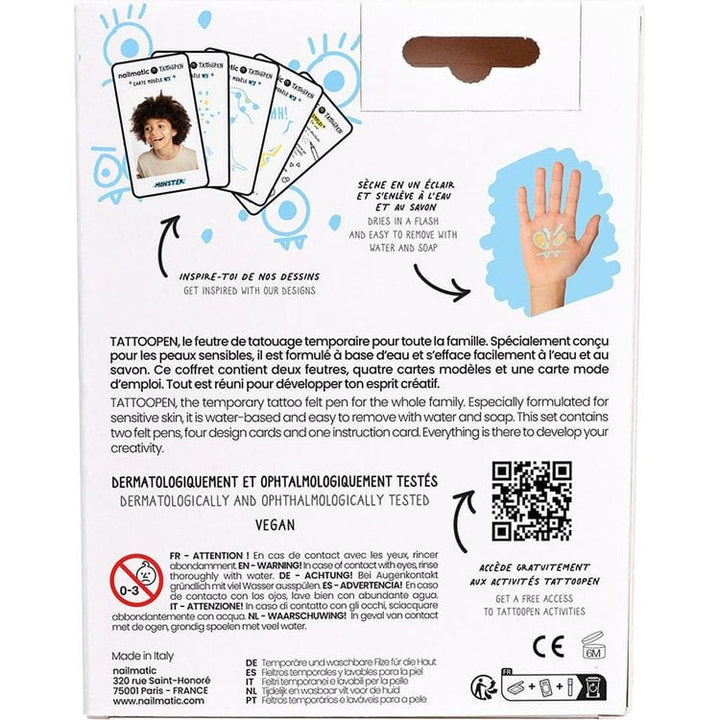Let's have fun drawing on skin! 2 temporary tattoos felt pens, along with template cards to get inspired: your little monsters will have so much fun! Each card provides inspiration drawings on the front and photo renderings on skin on the back. A box of ideas for creating lots of monster tattoos, yuck and yay! You can