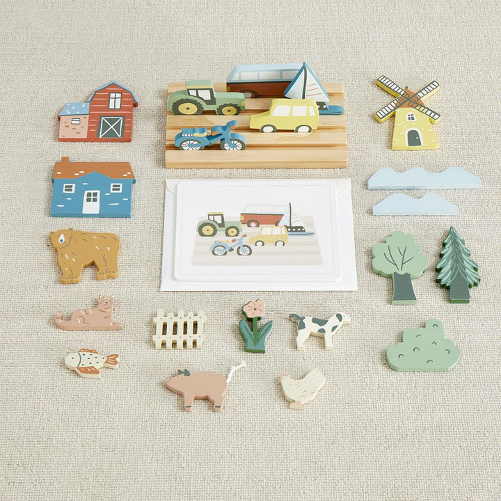 Our My Town Picture Matching Game is a great and fun way to help your kiddos learn placement and sequencing by matching the wooden objects to the pictures. Our high-quality set includes a chunky wooden base that holds 21 assorted vehicles, trees, houses, bikes and more. 12 cardboard pictures with scenes to match. L