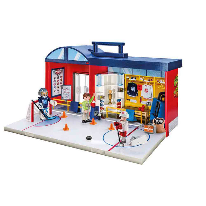 It’s game night at the NHL® Take Along Arena! Designed in a convenient take-along case, this set is perfect for on-the-go fun. Simply fold down the front panel to reveal an exciting hockey game. Players can get ready for the game in the locker room area, which also provides room to store all your hockey gear. Once the