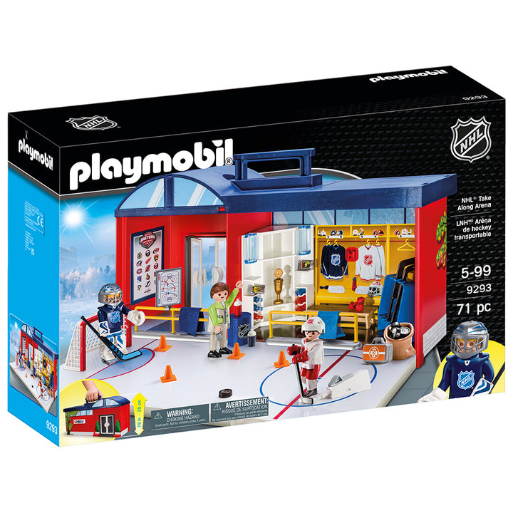It’s game night at the NHL® Take Along Arena! Designed in a convenient take-along case, this set is perfect for on-the-go fun. Simply fold down the front panel to reveal an exciting hockey game. Players can get ready for the game in the locker room area, which also provides room to store all your hockey gear. Once the