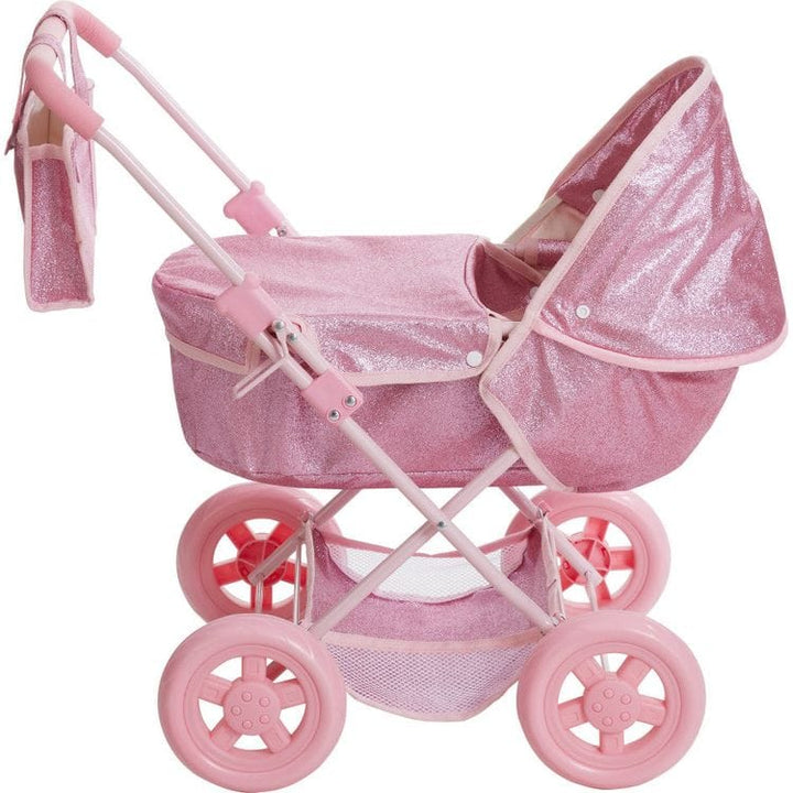 Take baby dolls and stuffed animals for walks inside and out with this pram-style doll stroller with a removable cover. Its durable hot pink glitter polyester material is wrapped around a kid-safe metal frame that collapses for travel or at clean-up time. The carriage has a retractable canopy, all-terrain wheels, a det