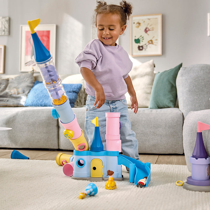 Calling all little builders! The princess castle, inspired by Disney's Cinderella, invites your child for endless exploration and tower combinations. Who can build the tallest tower and make it collapse first? Where is Cinderella's shoe hidden, and how can Cinderella quickly land in the arms of the prince? These questi