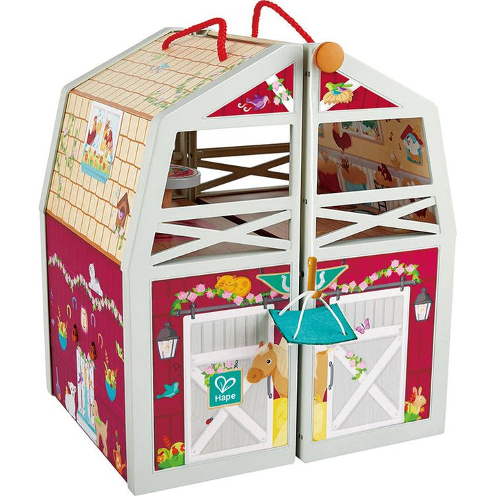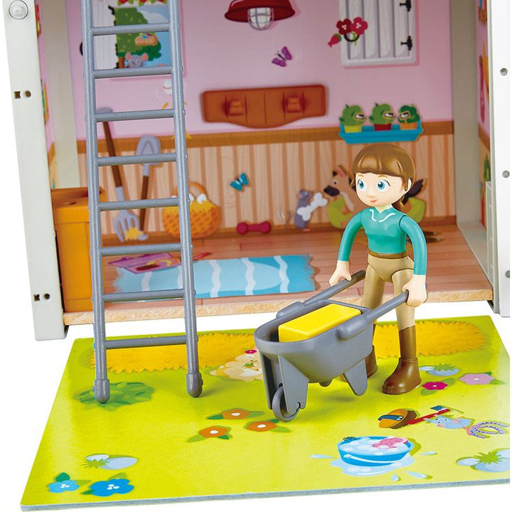This compact easy-to-store stable comes with 2 levels and loads of grooming and riding accessories. 25 pieces are included in this playset. Welcome to The Pony Club Ranch. This playset is sure to bring adventure to your little wrangler with so many ranch activities! Upstairs is a living area with a kitchen where your w