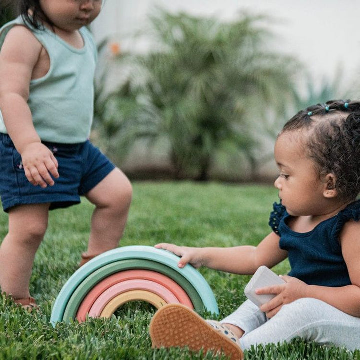 Toddlers will love to stack, nest or make different shapes with our Rainbow Nesting Blocks. Our nester comes with 6 arched pieces of stained wood, and will be a keepsake for sure. Materials: Wood and non-toxic stain Ages: 10 months & up Dimensions: 14 x 7.75 x 1.5 inches PLEASE NOTE: There is a shipping fee associ