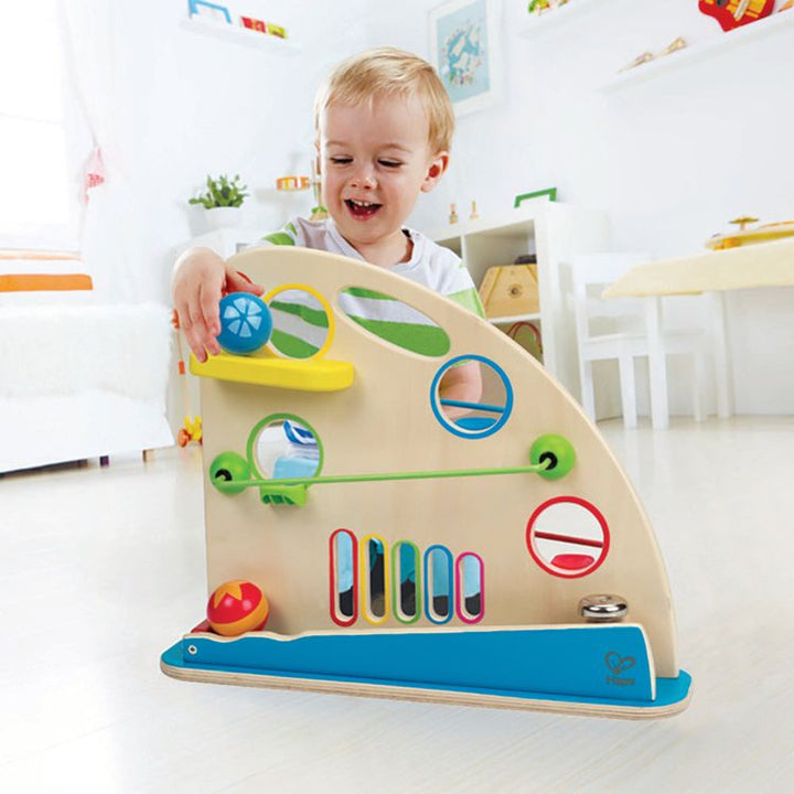 Hape’s Roller Derby creates an exciting world of fun of colorful wooden balls, peek-a-boo holes and fast tracks as the balls roll down the track in and out of site of the two-sided maze. The Peek-a-Boo hole on the top doubles as a carrying handle, making it easy to take out and tidy away. Discover the joy of guiding ob