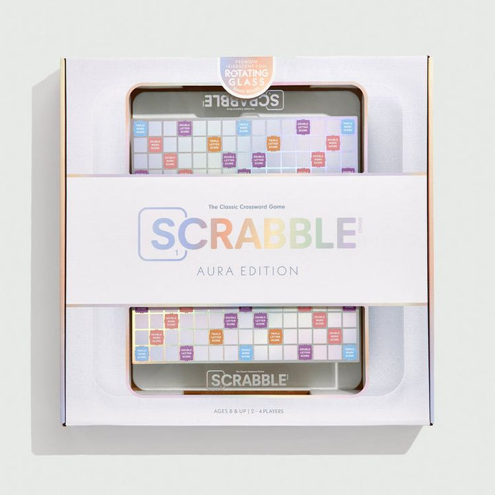 Game night gets a glow-up with Scrabble Aura Edition. This high-quality glass game board shimmers with serene colors that reflect the vibe of any room. Smoothly rotate the board and watch as iridescent foil accents illuminate every word, creating a mesmerizing play of light and color. Express your personal style like n