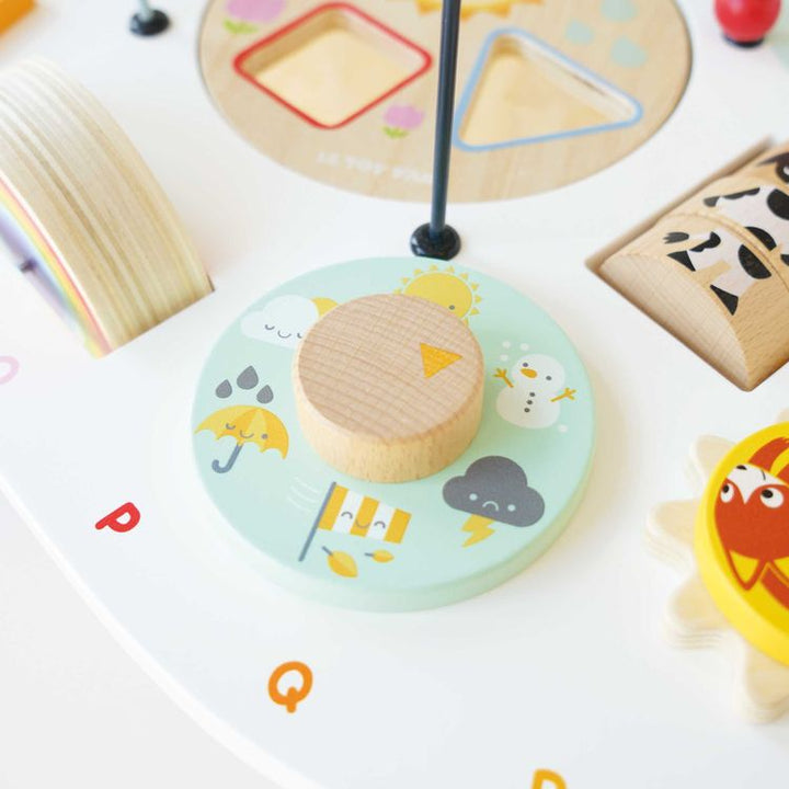 The activity table is packed with multi-sensory features to engage young, curious minds. Explore the centerpiece bead maze with a shape sorter underneath, the rainbow xylophone, scratch board, turning gears and cogs, spinning rattle and more! With textures to explore, pieces to move and a rainbow alphabet design this a