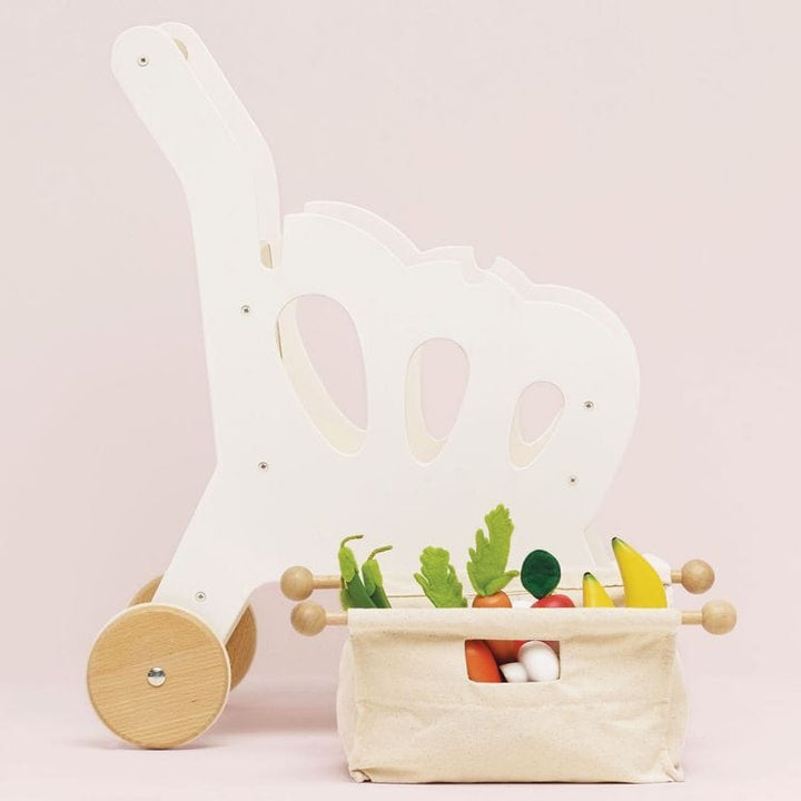 A stylish wooden shopping trolley with 2 internal compartments and a fabric storage level underneath. Special feature: a detachable  high quality fabric shopping bag and a mini chalkboard. An addition to the Le Toy Van Honeybake role play collection. This shopping trolley is great fun and helps children developing thei