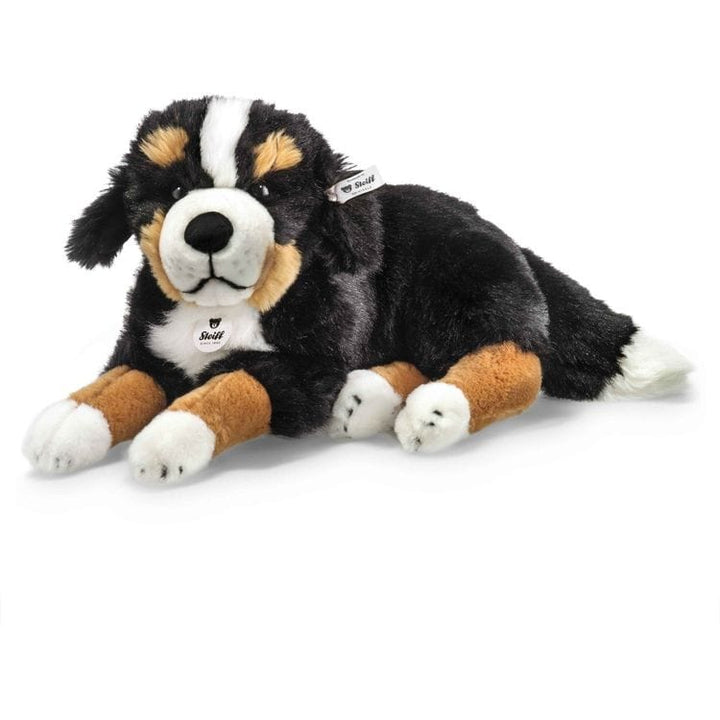 The adorably lifelike Bernese Mountain Dog is made of black, brown and white woven plush. Measuring an impressive 18 inches long, Siggi is the perfect cuddle buddy for children of all ages. Best of all, this plush dog is machine washable! Size: 18in made of cuddly soft woven fur- 76% polyacrylic, 24% cotton with stainl