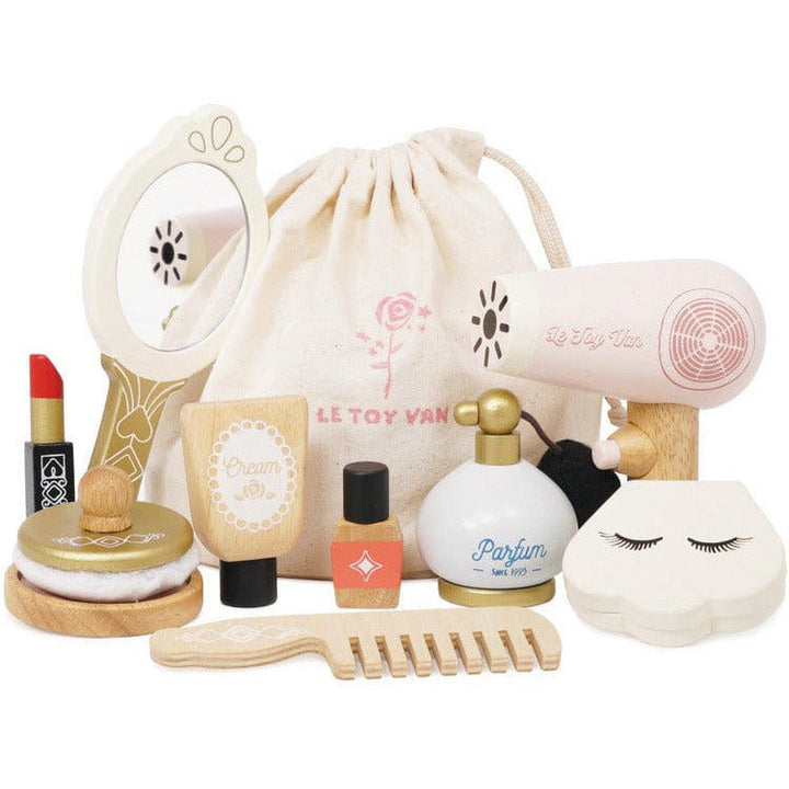 Be a star! Inside the cosmetics bag you'll find an assortment of wooden accessories including a vintage perfume bottle with a bulb atomiser, a hand held mirror, a hair dryer, a comb, a shell compact make up kit, a lotion, a nail varnish, a lipstick and a powder puff. Made from sustainable rubberwood, gold paint finish