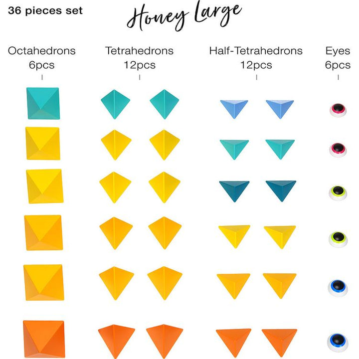 Explore the colors of honey and nature in this 36 piece set includes 6 octahedrons, 12 tetrahedrons, 12 half-tetrahedrons, 6 eyes (in total 36 pieces) + Leaflet + Limited Edition "Inspiration Book". With a large set you can either build one large construction or several smaller ones and share the process of creating wi