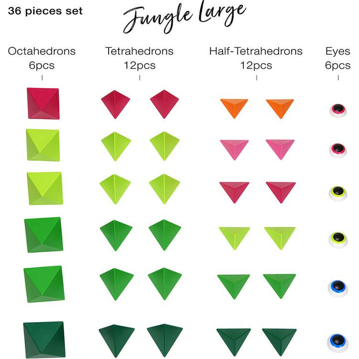 Bright Jungle colors abound in this 36-Piece Set includes: 6 octahedrons, 12 tetrahedrons, 12 half-tetrahedrons, 6 eyes (in total 36 pieces) + Leaflet + Limited Edition "Inspiration Book" With a large set you can either build one large construction or several smaller ones and share the process of creating with your fri