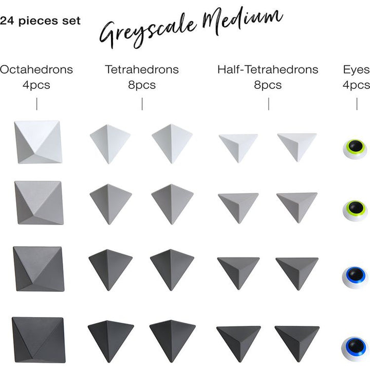 Black, grey and white scale pieces make up the monochromatic set which comes with 4 octahedrons, 8 tetrahedrons, 8 half-tetrahedrons, 4 eyes (24 pieces in total) + Leaflet. The 24-Piece Set is a medium building set that allows to build more characters and objects. Ages 3Y+ Materials: ABS PP magnetite Care instructions: