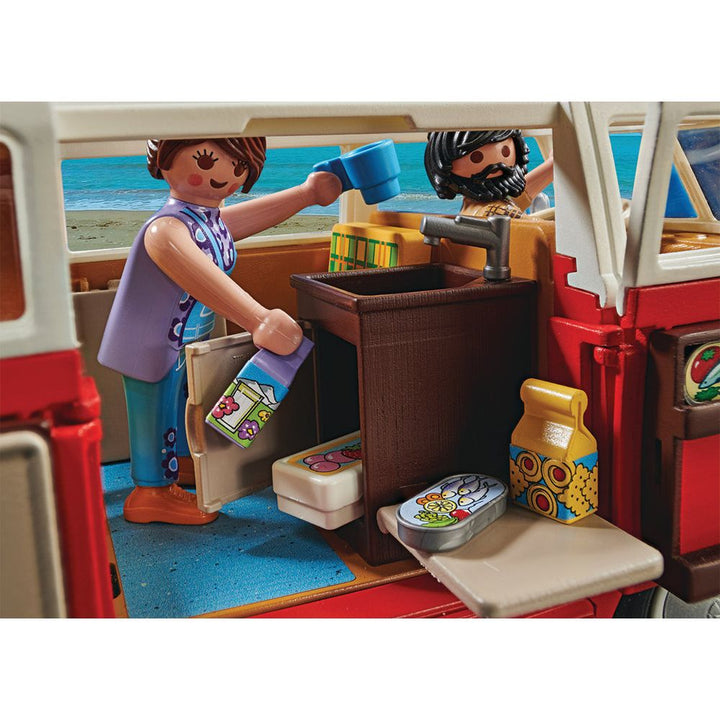 Plan for your next road trip with the Volkswagen T1 Camping Bus. The iconic red and white-colored van is equipped with a mini-kitchen, fold-down seating that converts into a sleeping area, and plenty of storage space. Remove the roof to access the camper's interior, seating figures at the table or behind the wheel. Ope