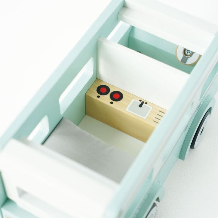 A vintage wooden holiday campervan featuring a detachable surf board. Lift off roof to reveal a bed with padded mattress and kitchenette area. Ages 3 yrs + Material: 80% Plywood, 15% Beech Wood, 1% Elastic, 2% Cotton, 2% Foam This product is a toy. Remove all packaging and keep for future reference. Check the toy each